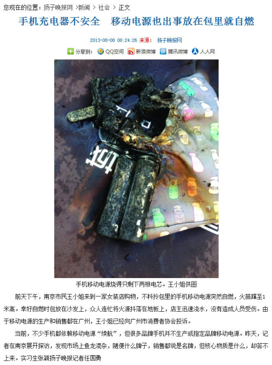 《揚(yáng)子晚報(bào)》在8月6日?qǐng)?bào)道:南京市民王小姐來(lái)到南京一家女裝店內(nèi)購(gòu)物,她將拎包放在沙發(fā)上,坐在一旁歇息。突然,王小姐聽到包內(nèi)發(fā)出“噗嗤”一聲響,隨后拎包還抖了一下。打開一看,王小姐發(fā)現(xiàn)1個(gè)月前買的手機(jī)移動(dòng)電源有些鼓脹,一摸還很燙手。那一刻,王小姐意識(shí)到移動(dòng)電源可能會(huì)自燃,便用紙巾捏住電池準(zhǔn)備拿出來(lái)。就在她取出移動(dòng)電源的瞬間起火了。她迅速將電源抖落在地,但是火苗已經(jīng)將拎包燒出一個(gè)大窟窿。王小姐心有余悸地告訴記者,當(dāng)時(shí)電池躥出的火苗最高約1米,噴濺到人身上肯定會(huì)被灼傷。當(dāng)時(shí)服裝店內(nèi)煙霧彌漫,焦糊味刺鼻。電池外殼幾乎燒光,留下兩根電芯。再一看,沙發(fā)被熏黑了,地板留下一塊電池形狀的深深烙印。