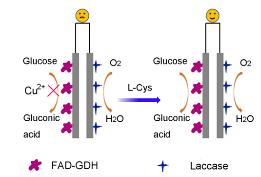 生物燃料電池利用酶或產電微生物為生物催化劑,通過電化學途徑把生物質燃料中的化學能直接轉化為電能,從而提供清潔的能源。此前,生物傳感技術團隊已經開發出一系列基于微生物表面展示酶的高性能生物燃料電池(L. Xia, et al., Biosensors & Bioelectronics 2013, 44, 160–163; Q. Lang, et al., Biosensors & Bioelectronics 2014, 51, 158–163; C. Hou, et al., Analytical Chemistry 2014, 86, 6057–6063.)。近日,該團隊博士后侯傳濤等人分別以黃素腺嘌呤二核苷酸型葡萄糖脫氫酶(FAD-GDH)和漆酶(laccase)制備生物陽極和生物陰極,構筑了高性能的葡萄糖/氧氣生物燃料電池,最大輸出功率密度98 μW cm-2,開路電位高達0.78 V。進一步研究發現,Cu2+可以明顯抑制該燃料電池的開路電位,而L-半胱氨酸(L-Cys)通過與Cu2+作用形成Cu-S鍵,能夠除去電極表面的Cu2+,從而有效地恢復燃料電池的開路電位。利用該原理設計開發了自供電的L-半胱氨酸傳感器(如圖)。