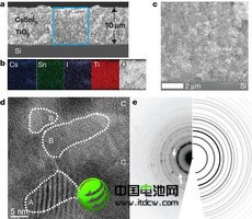 電子顯微鏡圖像顯示的橫斷面,屬于硅上的CsSnI3/TiO2電池。