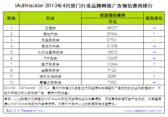 2013年4月熱門行業(yè)品牌網(wǎng)絡廣告投放數(shù)據(jù)