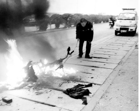 王先生趕緊跳下來,“不到半個(gè)小時(shí)就燒成一副架子了。”王先生的同事、車主宋先生說,“這輛車是在中州大道上一家專賣店里買的。牌子是‘濟(jì)南輕騎’,花了3000多元,才用了兩個(gè)月。”