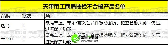 2012年11月,天津市濱海新區工商局在流通領域對標稱天津市10家企業生產的10個批次電動自行車開展質量監測。依據GB17761-1999《電動自行車通用技術條件》及經備案現行有效的企業標準和產品明示質量要求。重點檢測了最高車速、制動性能、車架/前叉組合件振動強度、整車質量、把立管靜負荷、腳蹬間隙、鞍座調節夾緊強度、絕緣性能、制動斷電裝置、欠壓、過流保護功能等10項指標。主要問題是2個批次最高車速、2個批次車架/前叉組合件振動強度、2個批次把立管靜負荷、2個批次欠壓、過流保護功能指標不合格。