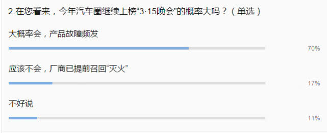 鑒于產(chǎn)品故障頻發(fā),高達(dá)70%的參與者認(rèn)為汽車(chē)圈上榜今年“3.15”晚會(huì)將成大概率事件,且德系、自主品牌、美系成參與者預(yù)測(cè)上榜概率最大的三大車(chē)系。