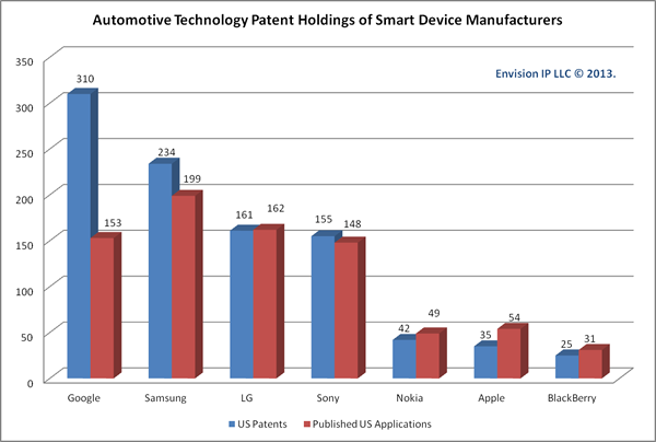根據(jù)專業(yè)機(jī)構(gòu)Envision-IP分析統(tǒng)計(jì),目前谷歌、三星電子、LG電子、索尼、諾基亞、蘋果和黑莓都已經(jīng)獲得了大量和汽車有關(guān)的專利,顯示在智能汽車和混合/電動(dòng)汽車的發(fā)展中,科技公司可能已經(jīng)超越汽車廠商成為主角。