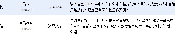 周一晚間海馬汽車(000572)在全景網互動平臺上表示,公司新能源產品已經量產。公司還表示,目前公司正在研究無人駕駛相關技術,并制定推進計劃。