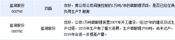 鹽湖股份(000792)周一在全景網(wǎng)互動平臺表示,公司1萬噸碳酸鋰裝置2015年生產(chǎn)有了重大進(jìn)展,生產(chǎn)碳酸鋰3700噸,尚未達(dá)產(chǎn),2016年會進(jìn)一步提高產(chǎn)量。