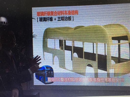 這是一種新型的高強度碳纖維復合材料車身,不僅具有輕量化,更具有高強度。這是山東泰汽電動車輛(集團)有限公司與韓國TGM公司展出的新款全新碳纖維結構電動客車。