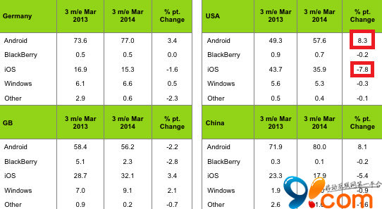 來自市場調查機構Kantar Worldpanel ComTech公布的移動操作系統市場份額的最新數據顯示,在美國市場,2014年第一季度安卓的市場份額同比增長了8%,占據智能手機市場份額的57.6% ,位列第一;相比之下,蘋果的iOS卻下滑了7.8%,市場占有量縮減至35.9%;排在第三的是微軟的操作系統Windows Phone,其市場份額為5.3%,下降幅度為0.3;第四位是黑莓,其市場份額僅占0.7%。