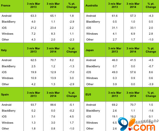 目前,只有在日本市場,蘋果iOS的份額才領先于安卓,iOS的占有率達到57.6%,安卓為41.5%。此外,意大利是微軟Windows Phone市場占有率最高的國家,達到了13.9%。
