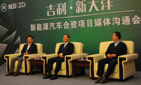 2015年1月10日吉利與新大洋成立知豆合資公司發布會上,新大洋集團董事長鮑文光(左)吉利集團董事長李書福(中)清華大學汽車系教授陳全世(右)在臺上接受記者問答)
