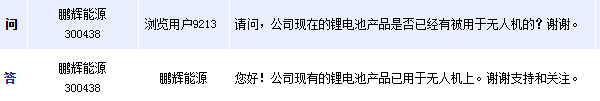 鵬輝能源(300438)周一在全景網互動平臺表示,公司現有的鋰電池產品已用于無人機上。