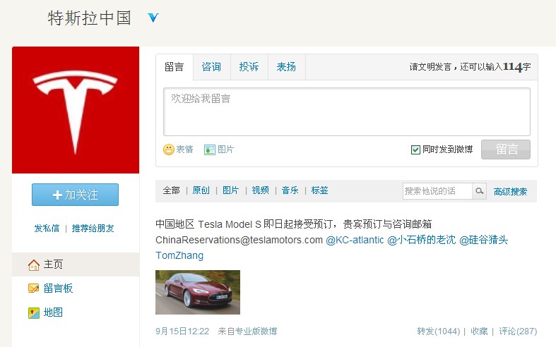 9月15日上午11:51,特斯拉中國官方微博發布微博稱,“歡迎大家關注Tesla Motors Inc.,@特斯拉中國 是Tesla 豪華電動汽車在中國地區的官方微博?!本o接其后,這個已有了19587個“特斯拉粉”的微博發布了第二條微博稱:“中國地區 Tesla Model S 即日起接受預訂,貴賓預訂與咨詢郵箱 [email protected]”,截止9月15日23:45,該微博被轉發938次,有259條評論。