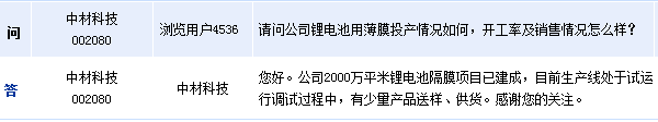 中材科技(002080)周五在全景網互動平臺上表示,公司2000萬平米鋰電池隔膜項目已建成,目前生產線處于試運行調試過程中,有少量產品送樣、供貨。