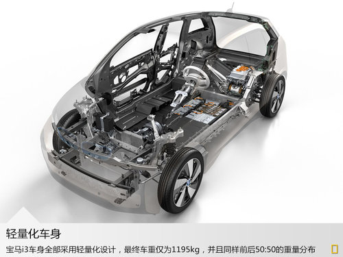 作為寶馬的未來的技術的體現(xiàn),寶馬i3匯聚了寶馬最新的科技與車中,在車身重量上寶馬i3已經(jīng)足夠輕質化,僅為1195kg,并且在含有的數(shù)量眾多的電池組整車上還做到了前后50:50的重量比,這將保證寶馬i3一定的操控性能。
