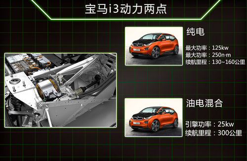在動力上寶馬i3將分為純電動版以及油電混合版,在純電動版本中寶馬i3配備了一臺功率最大功率125kw,最大扭矩250nm的電動機,讓寶馬i3百公里加速僅為7.2秒,續(xù)航里程在130公里~160公里之間,而帶有雙缸引擎的寶馬i3則最大續(xù)航里程則會超過300公里。