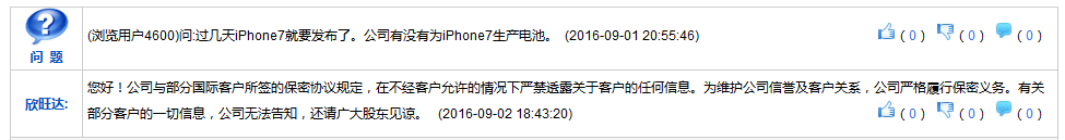 有投資者在互動平臺上向欣旺達求證,過幾天iPhone7就要發布了,公司有沒有為iPhone7生產電池。