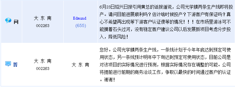 大東南(002263)周三在全景網(wǎng)互動(dòng)平臺(tái)上回答投資者提問(wèn)時(shí)表示,公司兩條光學(xué)膜生產(chǎn)線,一條線計(jì)劃于今年年底達(dá)到預(yù)定可使用狀態(tài),另一條線預(yù)計(jì)明年中下旬達(dá)到預(yù)定可使用狀態(tài),目前公司正對(duì)該項(xiàng)目的實(shí)際情況進(jìn)行預(yù)測(cè),根據(jù)實(shí)際情況存在調(diào)整的可能。公司將提前進(jìn)行前期的商務(wù)洽談工作,爭(zhēng)取以最快的時(shí)間通過(guò)客戶(hù)的認(rèn)證。(全景網(wǎng))