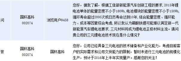 周三晚間國軒高科(002074)在全景網(wǎng)互動平臺上表示,公司已經(jīng)具備三元電池的技術(shù)儲備和產(chǎn)業(yè)化能力,考慮目前客戶的實際需求和公司交貨能力的限制,暫時未進(jìn)行三元電池的規(guī)模化生產(chǎn),預(yù)計于2016年上半年實現(xiàn)量產(chǎn)。