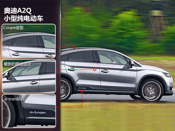 另外該款全新車型在外觀造型上將突出運動特性,四邊形頭燈加上帶狀LED行車燈與目前奧迪最新的設計語言十分相似。同時因全新車型是一款純電動產品,前進氣格柵尺寸明顯減小,不過奧迪經典的多邊形大嘴設計還是得以保存。A2Q的層面造型略有幾分Coupe風格,硬朗的雙腰線設計增加了整車的側面立體感。