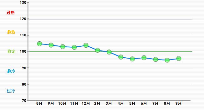 9月份中輕景氣指數(shù)為95.78,位于“穩(wěn)定”區(qū)域。與8月份相比中輕景氣指數(shù)回升0.97。