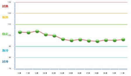 11月份中輕景氣指數為96.36 ,位于“穩定”區域。與10月份相比中輕景氣指數上升0.74。