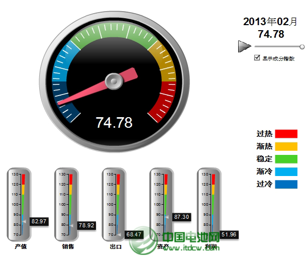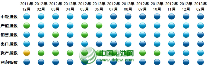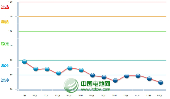 2013年3月19日,中國(guó)輕工業(yè)信息中心發(fā)布2013年2月中輕電池景氣指數(shù)。2月份中輕電池景氣指數(shù)為74.48,繼續(xù)停留在“過(guò)冷”提示區(qū)。其中:產(chǎn)值景氣指數(shù)89.27;銷售景氣指數(shù)78.92,首次進(jìn)入“過(guò)冷”提示區(qū);出口景氣指數(shù)68.47;資產(chǎn)景氣指數(shù)87.30;利潤(rùn)景氣指數(shù)51.96。