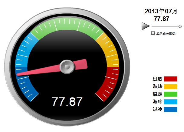 2013年7月中輕電池景氣指數(shù)為77.87,繼續(xù)停留在“過冷”提示區(qū),較3月的68.56有較大提升。