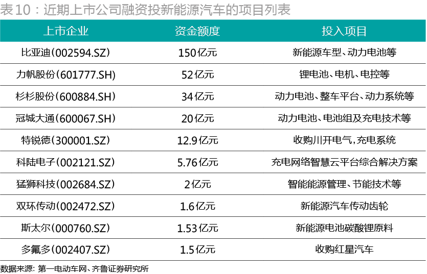 2015年5月以來(lái),10余家上市企業(yè)宣布或者計(jì)劃增加對(duì)新能源汽車產(chǎn)業(yè)的投入(表10)。從新能源汽車領(lǐng)域的產(chǎn)能對(duì)比看,比亞迪已遙遙領(lǐng)先同行,在新能源汽車領(lǐng)域暫無(wú)匹敵者。比亞迪稱,今年計(jì)劃銷售新能源汽車6萬(wàn)-7萬(wàn)臺(tái),其中K9大巴約5000臺(tái),私家車5萬(wàn)臺(tái)以上。
