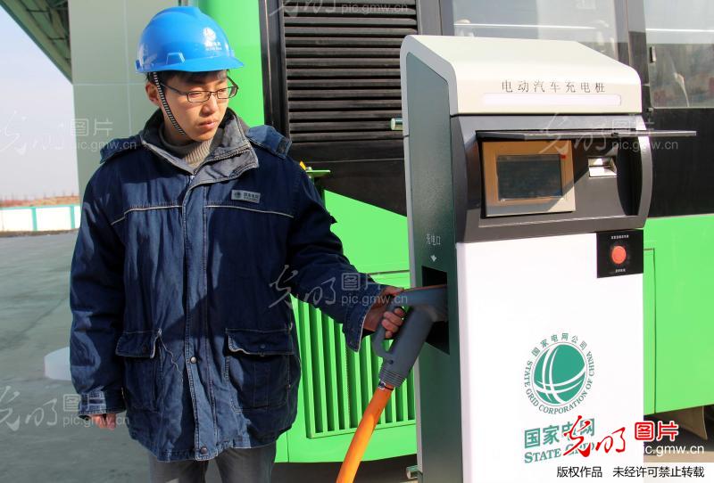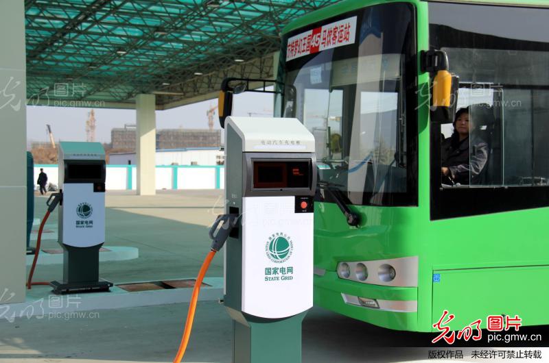 2013年12月28日,在安徽省蕪湖市國家電網(wǎng)飛陽電動汽車充電站內(nèi),一輛45路公交車正在這里充電準(zhǔn)備上路,這輛公交車成為蕪湖首輛新能源電動公交車。