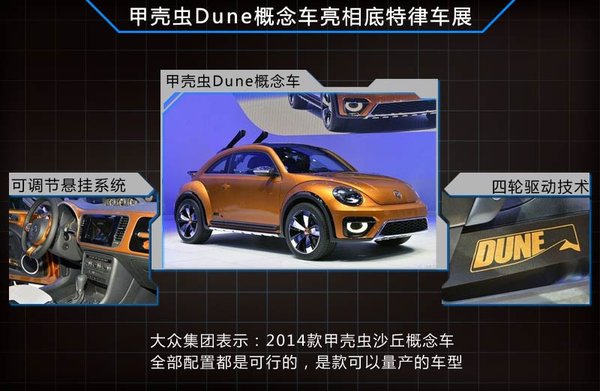 大眾在底特律車展亮相了甲殼蟲Dune(沙丘)第二代概念車,新車除外觀更越野外,對內(nèi)飾也進行了升級,并標注了“Dune”的醒目標識。新車還采用了可 調(diào)節(jié)式懸掛系統(tǒng),以應對各種路面情況。動力方面,新車將會搭載一臺最大功率為155KW的2.0L渦輪增壓發(fā)動機,與之匹配的是DSG六擋雙離合變速箱, 其有望在2015年推出量產(chǎn)版本。
