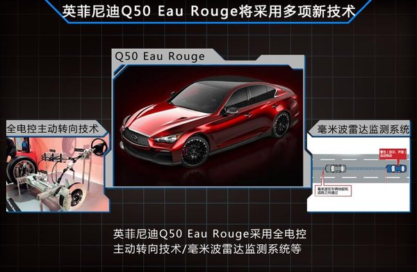 英菲尼迪Q50 Eau Rouge搭載了全電控主動轉(zhuǎn)向技術、毫米波雷達監(jiān)測系統(tǒng)等多項駕駛輔助系統(tǒng)。英菲尼迪全球執(zhí)行設計總監(jiān)阿方索先生表示:“性能是英菲尼迪基因中的重要支 柱,Q50 Eau Rouge在設計上表達了對這一理念更加深入的詮釋。另外,英菲尼迪Q50匯聚了大量科技,為高性能版本提供了絕佳的基礎?!贝送?,新車還采用了全新 Infiniti InTouchTM人機交互系統(tǒng),并應用首創(chuàng)的雙觸屏設計并支持多點觸控,將傳統(tǒng)的信息顯示和功能操作兩大功能區(qū)分開,實現(xiàn)更為可靠的駕駛。