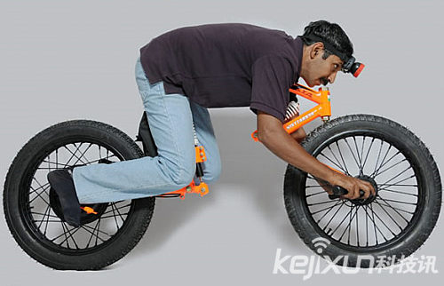 這輛自行車名為“Nisttarkya”其實是一輛概念電動自行車,看這輪胎也能知其一二,相當(dāng)?shù)膶挻?,加上電池整車重?0斤,很有分量。這輛電動自行車把手在前輪胎中軸,就是與中軸完全一體,包括剎車。另外其還有一個前大燈,但沒有安裝在車身前面,而是另外作為一個配件,使用時,需戴在頭上。