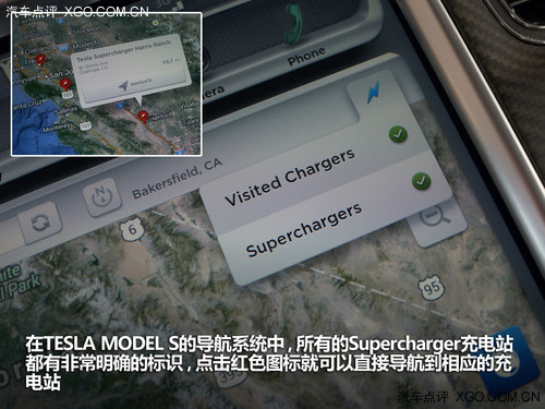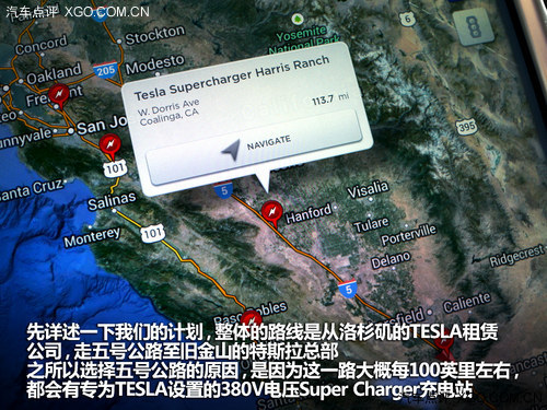 由于TESLA沿著西海岸建立了足夠多的充電站,這也是我們接下來敢從洛杉磯長途奔襲600余公里去舊金山的理論基礎(chǔ)。在TESLA MODEL S的導航系統(tǒng)中,所有的Supercharger充電站都有非常明確的標識,點擊紅色圖標就可以直接導航到相應的充電站。