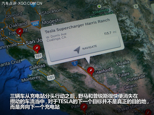三輛車從充電站分頭行動之后,野馬和普銳斯很快便消失在攢動的車流當中,對于TESLA的下一個目標并不是真正的目的地,而是奔向下一個充電站。