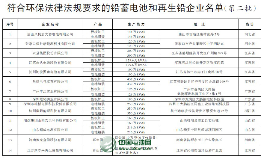 環境保護部近日發布了符合環保要求的鉛蓄電池和再生鉛企業名單公告(第二批),向社會公布了通過環保核查的唐山風帆宏文蓄電池有限公司等14家鉛蓄電池及再生鉛企業名單。