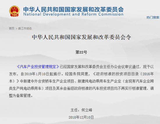汽車產(chǎn)業(yè)投資管理規(guī)定發(fā)布 新建合資與純電動(dòng)汽車項(xiàng)目改備案管理