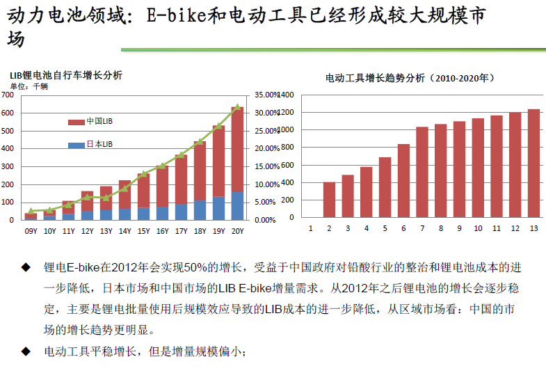 鋰電E-bike在2012年會實現(xiàn)50%的增長,受益于中國政府對鉛酸行業(yè)的整治和鋰電池成本的進一步降低,日本市場和中國市場的LIB E-bike增量需求。從2012年之后鋰電池的增長會逐步穩(wěn)定,主要是鋰電批量使用后規(guī)模效應導致的LIB成本的進一步降低,從區(qū)域市場看:中國的市場的增長趨勢更明顯。 電動工具平穩(wěn)增...
